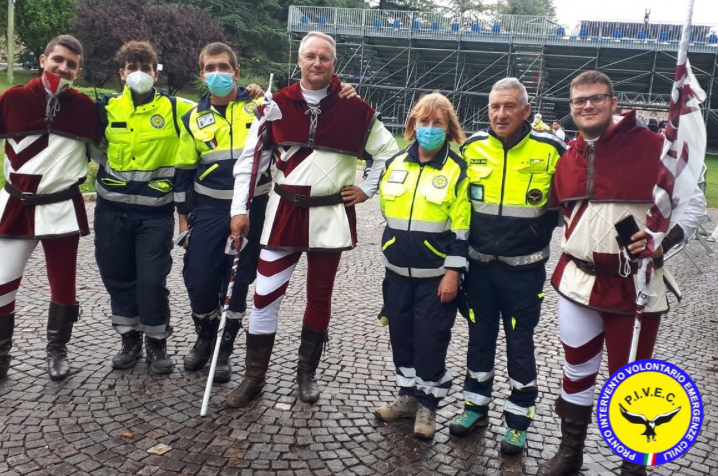 Volontari PIVEC di servizio presso la basilica di Collemaggio per l'apertura della porta Santa in occasione delle 727ª Perdoanaza Celestiniana, nella foto con gli amici di lunga data degli Sbandieratori Città dell'Aquila.